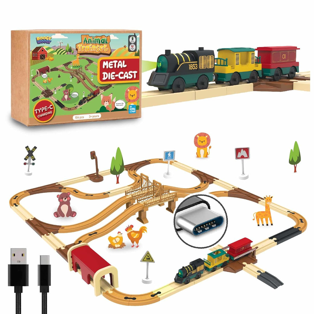 BOOGYWOOGY Metal Die Cast Jungle Theme 134 Pieces DIY Magnetic Toy Train Set - USB Rechargeable Type-C Engine, Interactive Magnetic Tracks, Educational STEM Toy for Kids, Creative DIY Playset