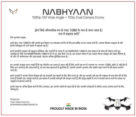 Unleash your inner pilot with the New NABHYAAN Drone, crafted by India's leading drone manufacturer, Electrobotic. This sleek and powerful quadcopter packs a punch of features, perfect for both beginners and seasoned enthusiasts.